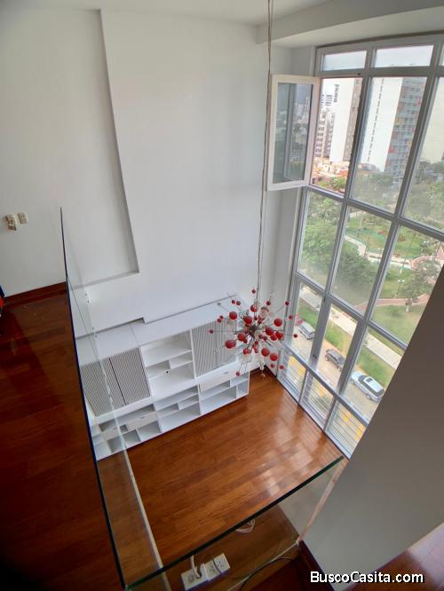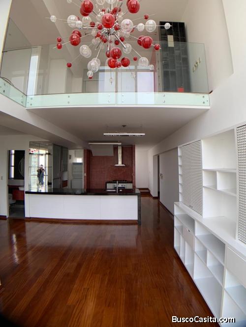 SALA, COMEDOR CON VISTA AL PARQUE Y TECHO DE DOBLE ALTURA