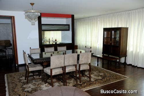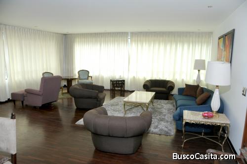 Se alquila hermoso y amplio departamento completamente amoblado, en una exclusiva zona de Miraflores y super céntrico, con un área de 200mts2, ubicado en el 4to piso, con ambientes amplios, consta de sala con excelente iluminación ventanales grandes y lámparas modernas, comedor, cocina con reposteros, 3 dormitorios, el dormitorio principal con baño interno, la habitación de servicio con despensa de toallas, área de lavandería. Equipado con juego de muebles confortables, juego de comedor, 1 despensa con llave en el área del comedor. 1 cochera. Hermosa recepción del edificio con jardín grande.