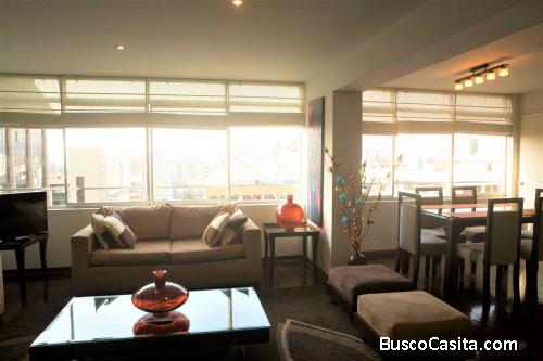 Alquiler de departamento en calle Tarata de Miraflores. El departamento se alquila completamente AMOBLADO Y EQUIPADO, cuenta con un área de 100 m2 y consta de sala, comedor, 2 habitaciones, 1 baño + ½ baño, lavadora, cocina y vista a la calle. Ubicado en el piso 15.
