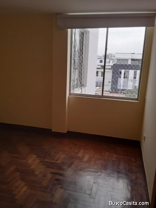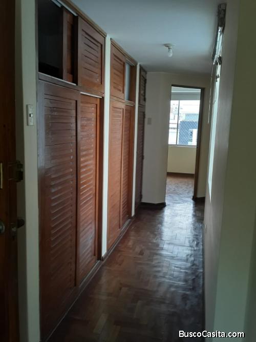 Se alquila lindo y amplio departamento de 75 m2 4to piso, consta de 2 dormitorios (ambos dormitorios cuentan con un closet incorporado), 1 baño con terma, 1 sala, 1 comedor, 1 cocina pequeña (Kitchenette).