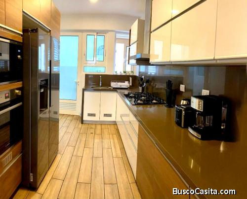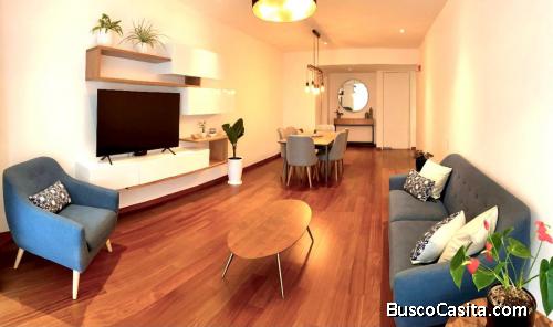 Amplio departamento de 135 m2 en piso 2, con 3 habitaciones, 3 baños completos, cocina equipada (con cocina, horno, campana extractora empotrados), amplia sala comedor, zona de lavandería y de servicio completa.