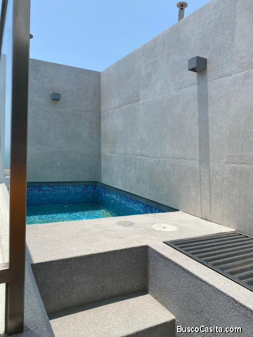 2 HABITACIONES CON BAÑO COMPLETO, TIENE TERRAZA, SALA COMEDOR, COCINA Y TIENE PISCINA PEQUEÑA. COCHERA Y DEPÓSITO.