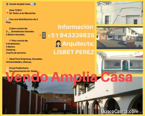 VENDO AMPLIA CASA DE 720M2 EN TODA LA AV, MANSICHE :CON UNA DISTRIBUCIÓN DEL 2° PISO ; 3 HABITACIONES GRANDES , 2° BAÑOS GRANDES ; 1° PISOS 9 AMBIENTES ,4 BAÑOS ,CISTERNA , CUARTO DE SERVICIO , PANEL PUBLICITARIO , CON TODAS SUS DOCUMENTACION EN REGLA