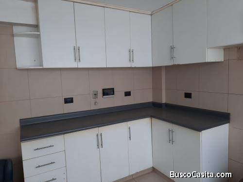 Sala comedor amplio, cocina con muebles altos y bajos de melamina.